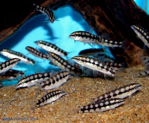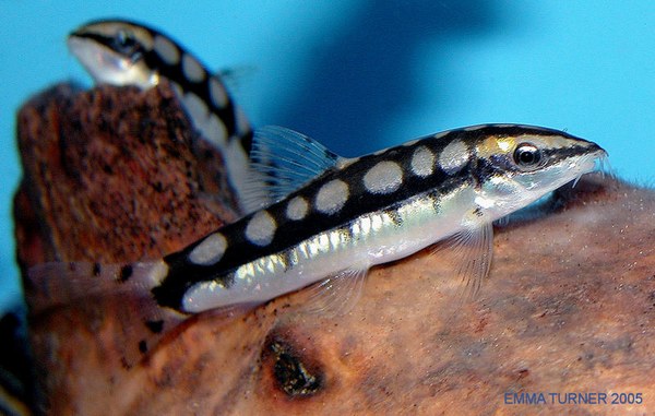 This Chained Loach is considered to be the smallest of its genus, reaching only 2 to 2 1/2 inches (5 - 6 cm) in length. It has been a popular fish and all sorts of common names are associated with it. They are derived from both its appearance and its interesting behaviors, as well as its scientific names. You can find it called Dwarf Chain Loach, Dwarf Botia, Monkey Botia, Chained Loach, Ladderback Loach, Pygmy Loach, Mouse Loach, Chipmunk Botia, Sid, and Sid Monkey Loach.
